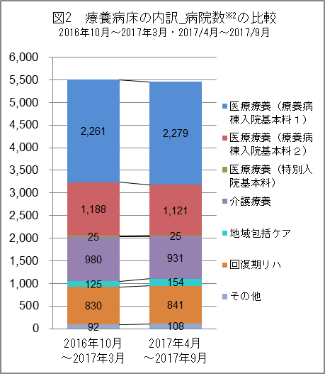 今回調査(2017年9月)の療養病床数を前回調査(2017年3月)と比較すると、半年間で介護療養は2,833床、療養病棟入院基本料2は3,539床減少した。一方、地域包括ケアや回復期リハなどは増加している。そのことを踏まえると他病棟へ転換していることがわかる(図1・図2)。